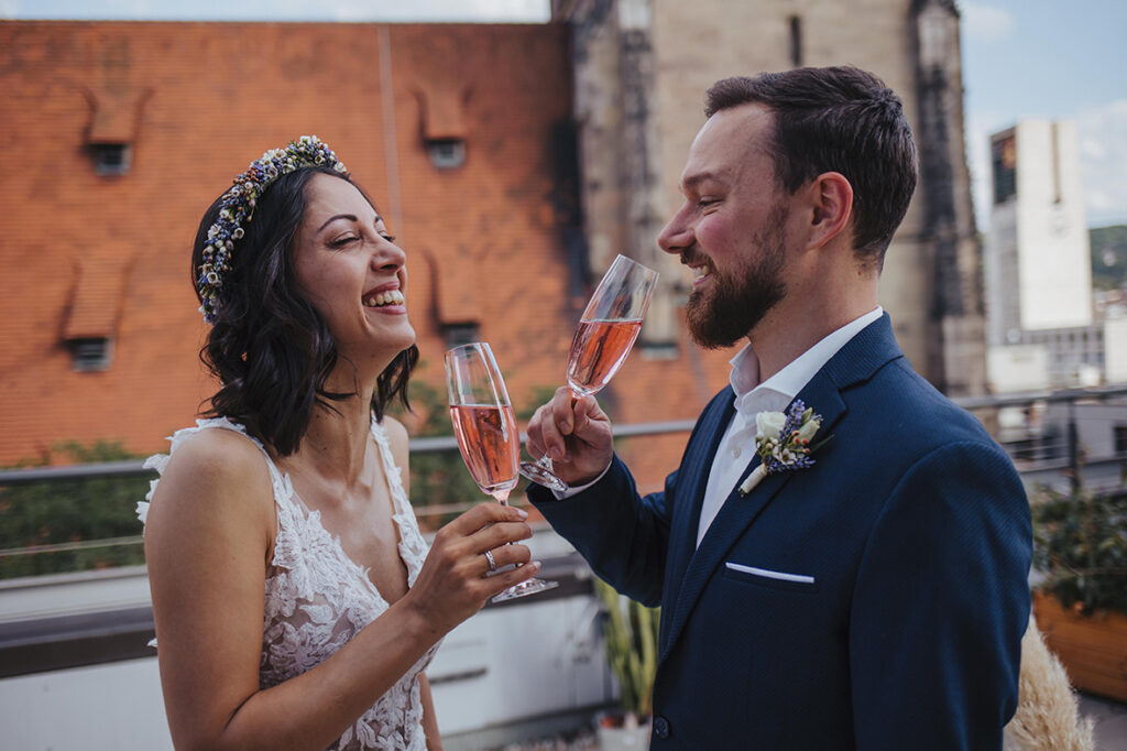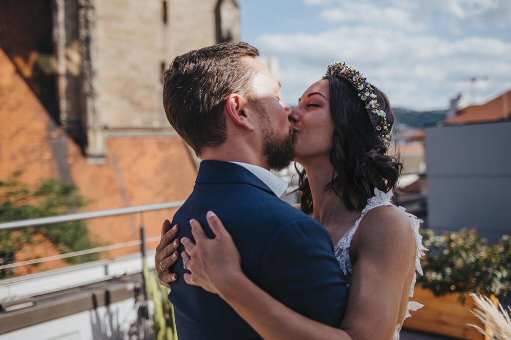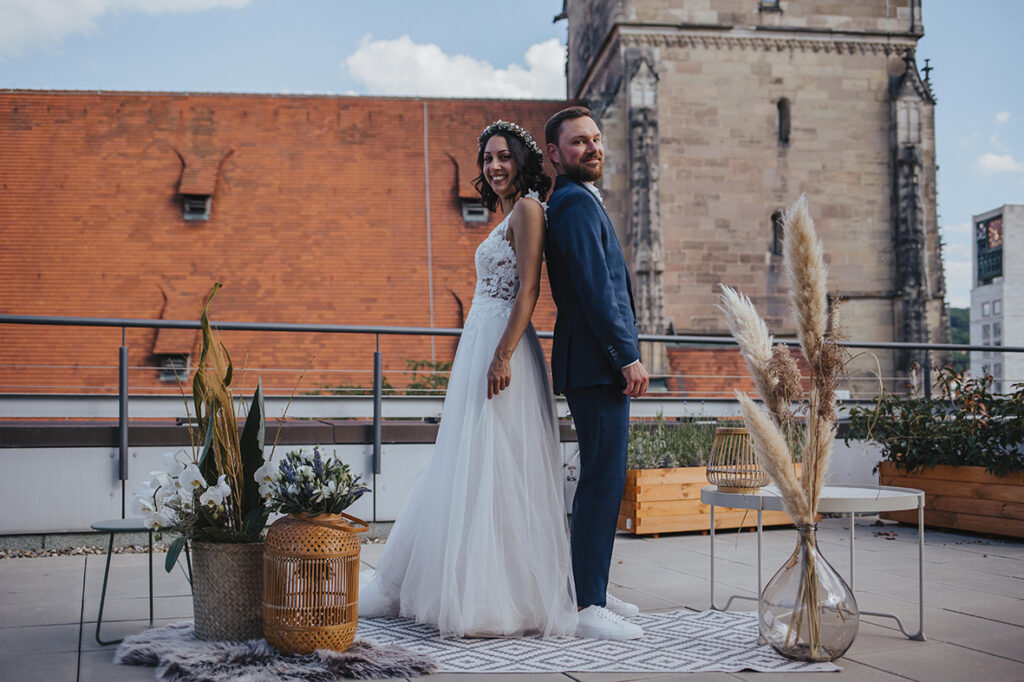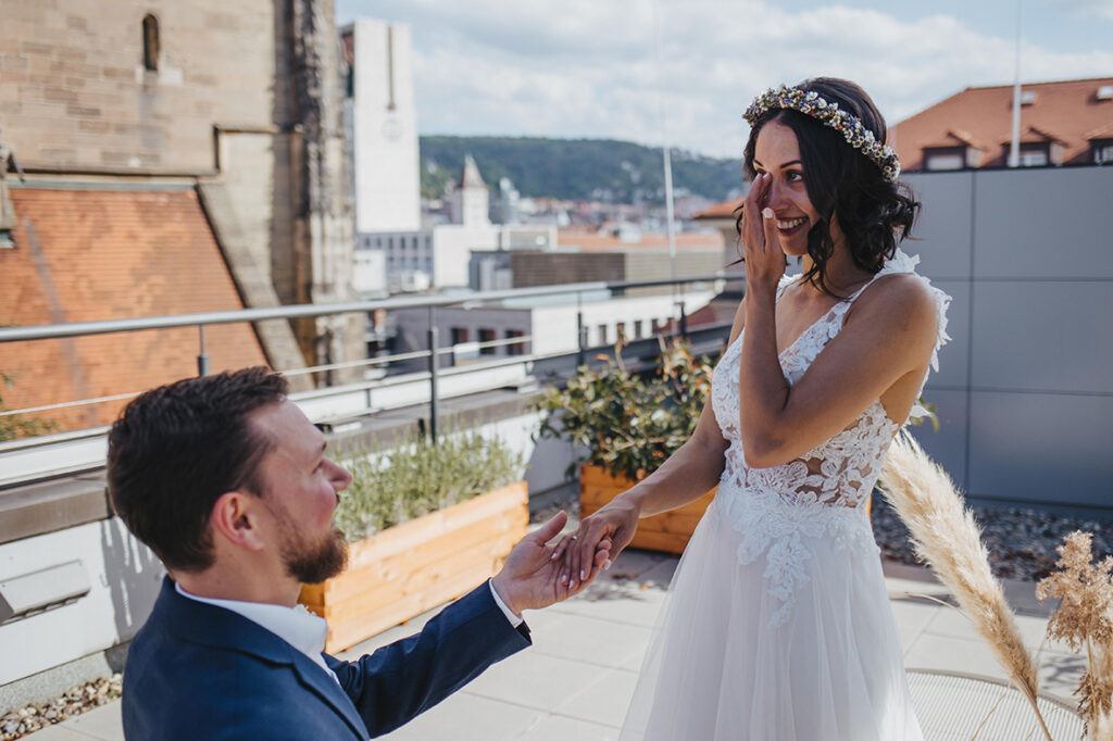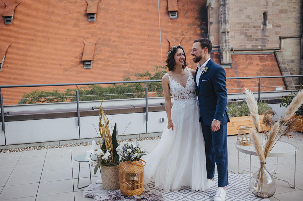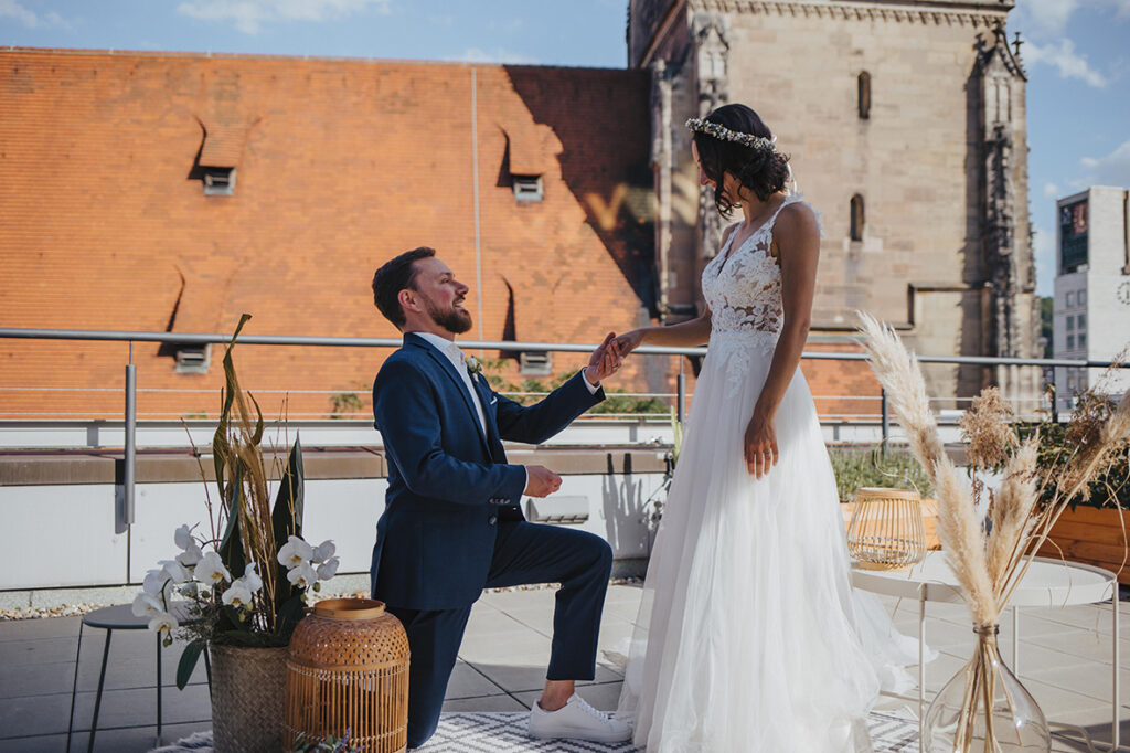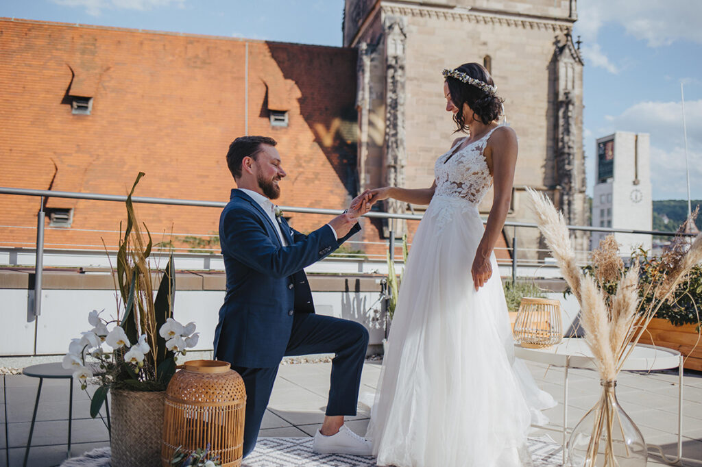 Zum zweiten Hochzeitstag, schenkte ich ihnen dann ein After Wedding Shooting und kurz darauf verabredeten wir uns auch schon an der genau gleichen Stelle, wo sie zwei Jahre zuvor JA zueinander sagten. So standen wir dann, an einem heißen Sommertag, zusammen auf der Dachterasse mitten in der Stuttgarter Innenstadt und dekorierten unsere Location. Die beiden waren ein bisschen aufgeregt – der magische Ort ihrer Trauung im Herbst 2020 löst im Sommer wohl trotzdem wohlige Gefühle aus. Ich bat Marc, sich eine kleine Überraschung für Kathi zu überlegen. Und nachdem wir uns locker getanzt, Quatsch gemacht und Sekt getrunken haben, war es dann soweit: Marc machte seiner Kathi nochmals einen Heiratsantrag. Diesen besonderen Moment begleiten zu dürfen erfüllt mich mit Liebe und Dankbarkeit. Ich wünsche den beiden, dass sie noch unendlich viele magische Momente in ihrem gemeinsamen Leben feiern dürfen. Und jetzt freue ich mich, euch die wunderschönen Bilder zu zeigen. Viel Spaß!