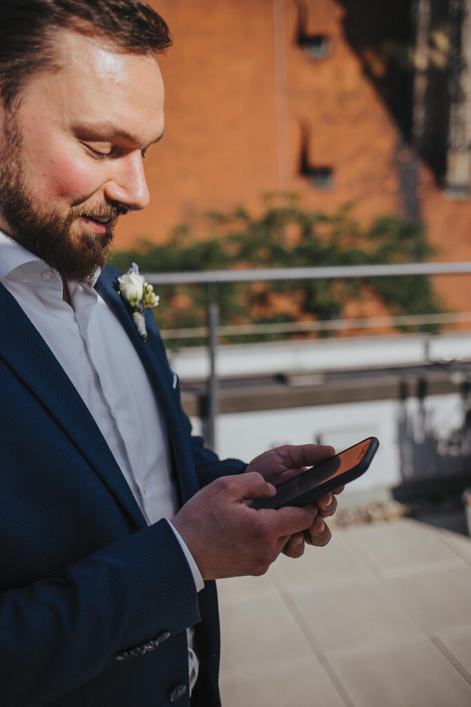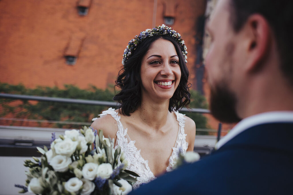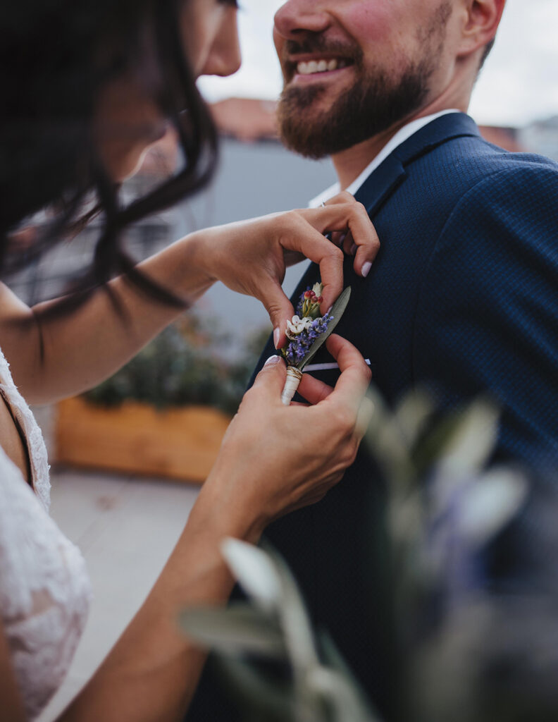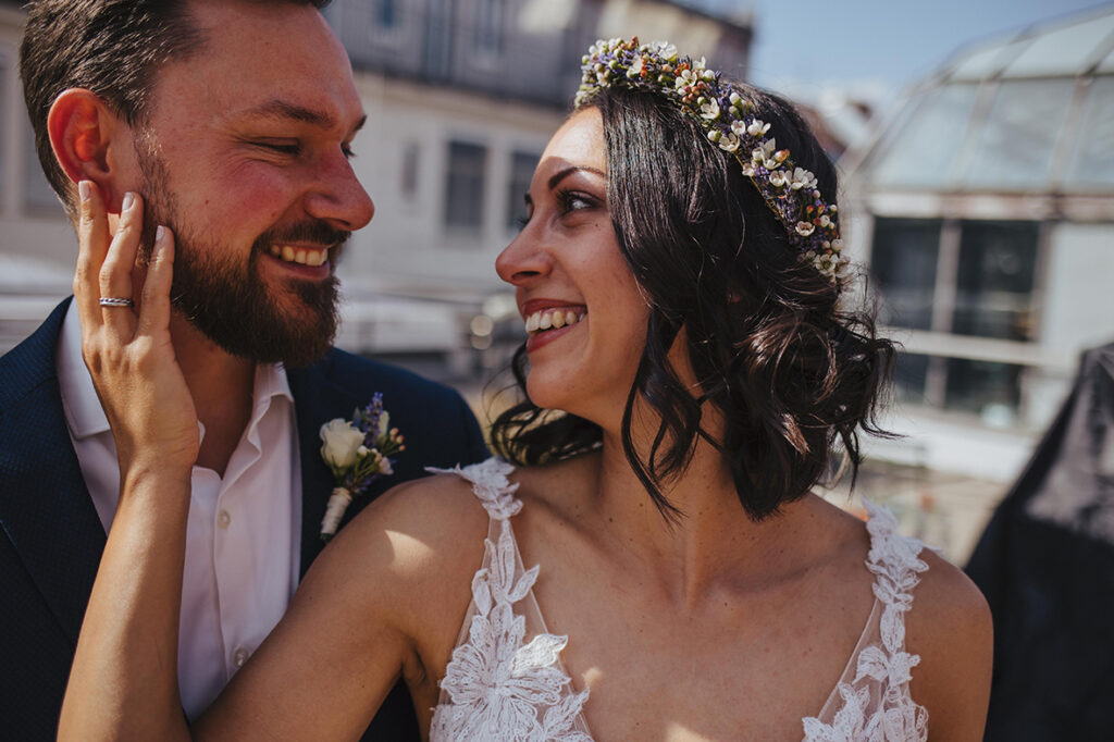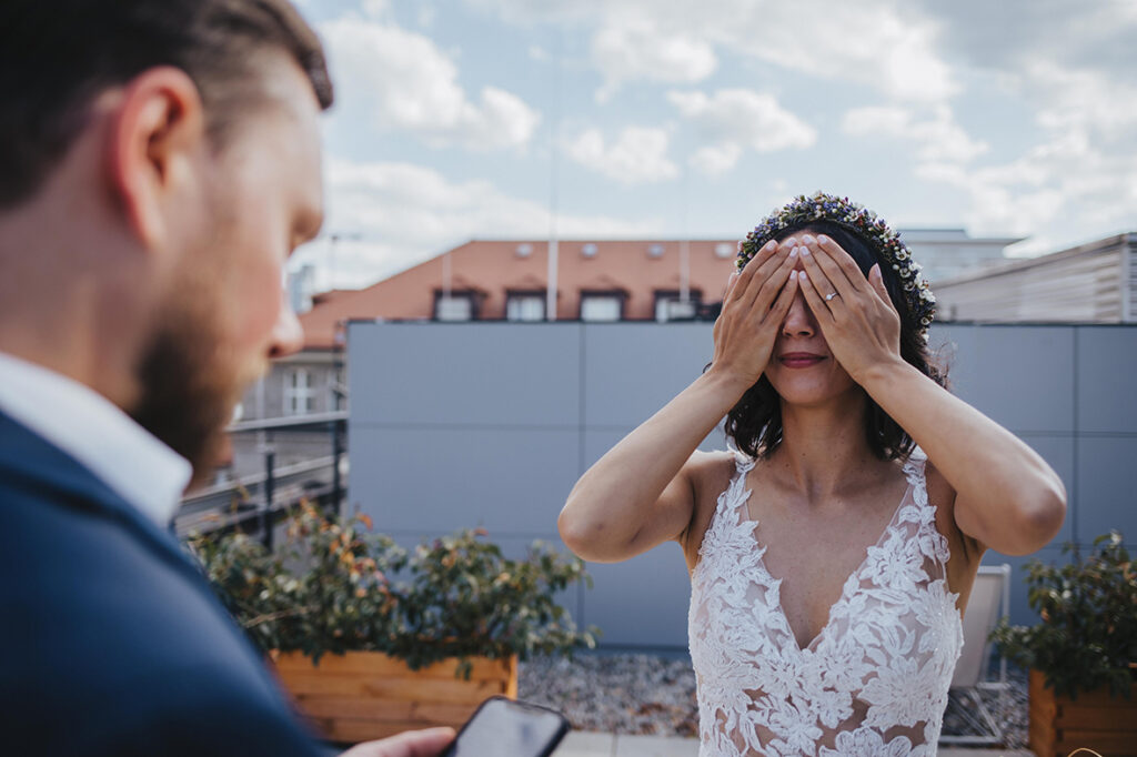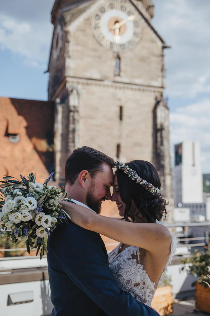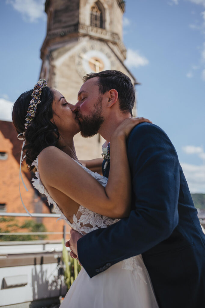 Zum zweiten Hochzeitstag, schenkte ich ihnen dann ein After Wedding Shooting und kurz darauf verabredeten wir uns auch schon an der genau gleichen Stelle, wo sie zwei Jahre zuvor JA zueinander sagten. So standen wir dann, an einem heißen Sommertag, zusammen auf der Dachterasse mitten in der Stuttgarter Innenstadt und dekorierten unsere Location. Die beiden waren ein bisschen aufgeregt – der magische Ort ihrer Trauung im Herbst 2020 löst im Sommer wohl trotzdem wohlige Gefühle aus. Ich bat Marc, sich eine kleine Überraschung für Kathi zu überlegen. Und nachdem wir uns locker getanzt, Quatsch gemacht und Sekt getrunken haben, war es dann soweit: Marc machte seiner Kathi nochmals einen Heiratsantrag. Diesen besonderen Moment begleiten zu dürfen erfüllt mich mit Liebe und Dankbarkeit. Ich wünsche den beiden, dass sie noch unendlich viele magische Momente in ihrem gemeinsamen Leben feiern dürfen. Und jetzt freue ich mich, euch die wunderschönen Bilder zu zeigen. Viel Spaß!