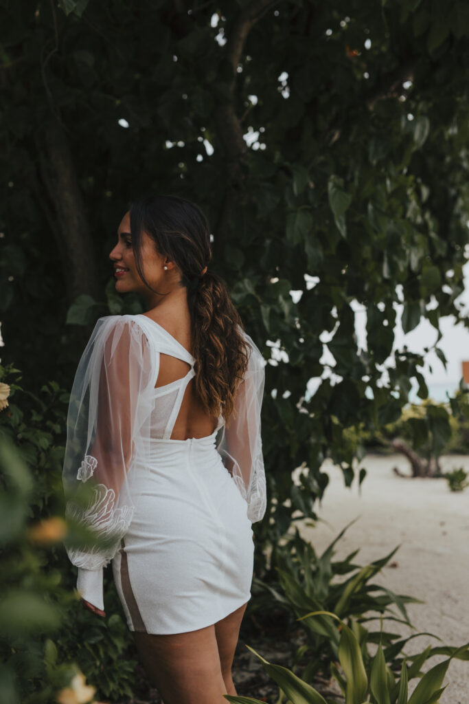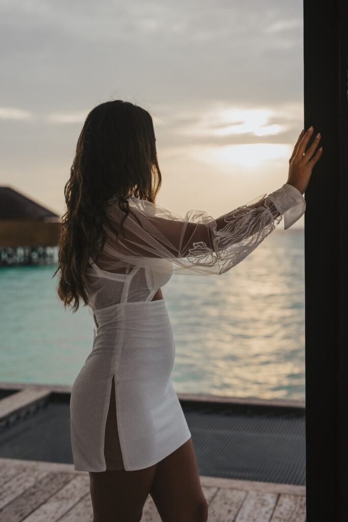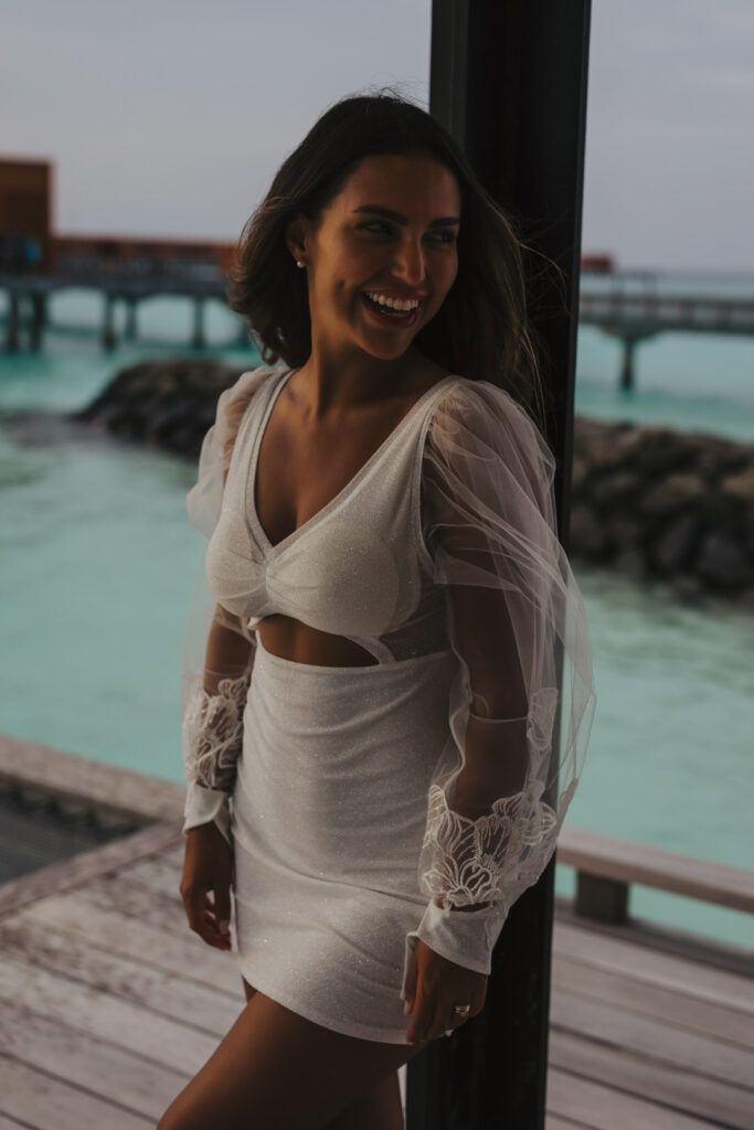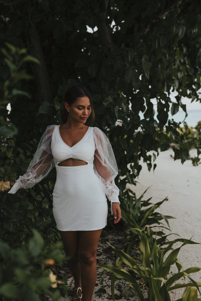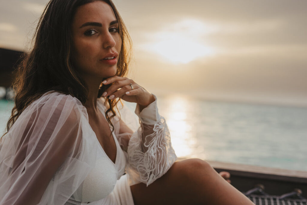 Hier traf ich dieses Mal zwei strahlend glückliche Menschen. Ich sprach Bianca nach ihrer Tauch-Session direkt an. Ich fand ihre Ausstrahlung und ihr Lächeln so umwerfend schön, dass ich sie unbedingt fotografieren wollte. Was für ein wunderbarer Zufall, dass die beiden auch tatsächlich hier ihre Flitterwochen verbrachten und am nächsten Tag bereits abreisen mussten – puh!Gerade noch rechtzeitig! So schlüpfte Bianca an diesem Abend vor Sonnenuntergang in das Brautkleid, das ich extra aus Deutschland mitgebracht hatte (Designer: pf-unikate.de). Stellt euch vor, es passte sogar wie angegossen.