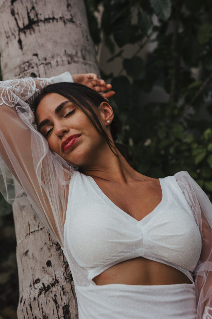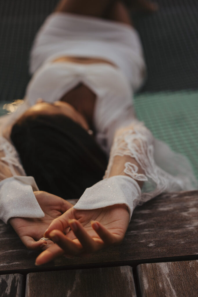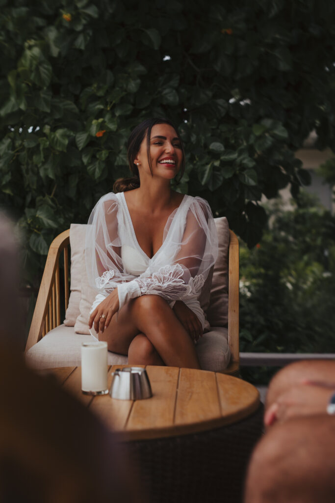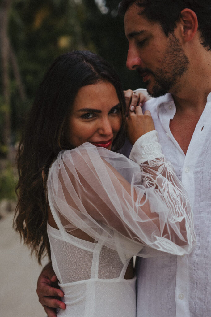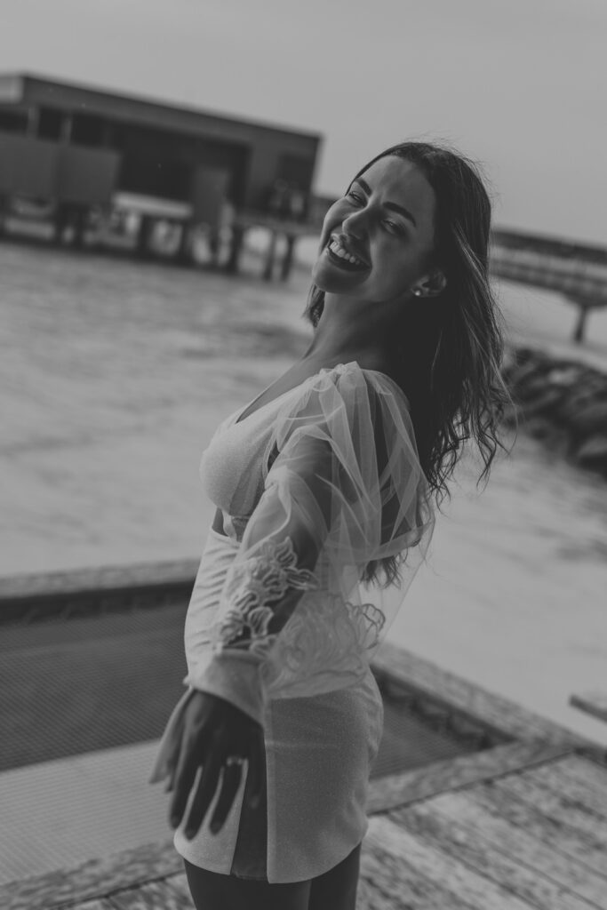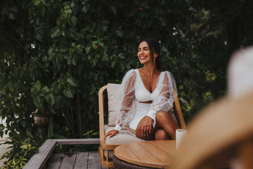 Hier traf ich dieses Mal zwei strahlend glückliche Menschen. Ich sprach Bianca nach ihrer Tauch-Session direkt an. Ich fand ihre Ausstrahlung und ihr Lächeln so umwerfend schön, dass ich sie unbedingt fotografieren wollte. Was für ein wunderbarer Zufall, dass die beiden auch tatsächlich hier ihre Flitterwochen verbrachten und am nächsten Tag bereits abreisen mussten – puh!Gerade noch rechtzeitig! So schlüpfte Bianca an diesem Abend vor Sonnenuntergang in das Brautkleid, das ich extra aus Deutschland mitgebracht hatte (Designer: pf-unikate.de). Stellt euch vor, es passte sogar wie angegossen.