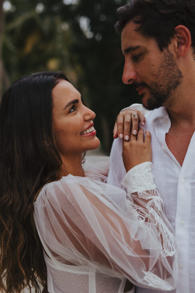 Desta vez, conheci duas pessoas radiantemente felizes aqui. Abordei Bianca logo após sua sessão de mergulho. Achei seu carisma e sorriso tão deslumbrantes que tive vontade de fotografá-la. Que coincidência maravilhosa que os dois estivessem passando a lua de mel aqui e tivessem que ir embora no dia seguinte — ufa! Bem na hora! Então, naquela noite, antes do pôr do sol, Bianca vestiu o vestido de noiva que eu havia trazido especialmente da Alemanha (designer: pf-unikate.de). Imagine, ele até serviu como uma luva.